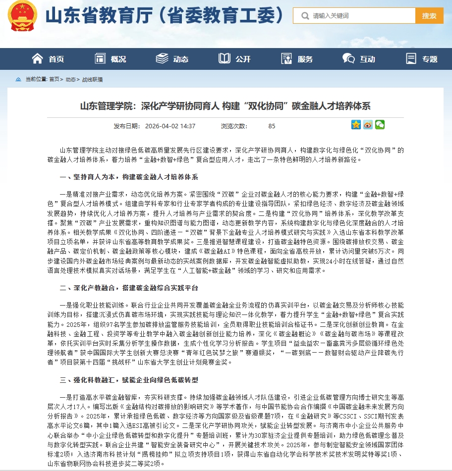 4月2日,山东省教育厅(省委教育工委)以《山东管理学院:深化产学研协同育人 构建“双化协同”碳金融人才培养体系》为题,报道我校主动对接绿色低碳高质量发展先行区建设要求,深化产学研协同育人,构建数字化与绿色化“双化协同”的碳金融人才培养体系,着力培养“金融+数智+绿色”复合型应用人才,走出了一条特色鲜明的人才培养新路径的经验做法。